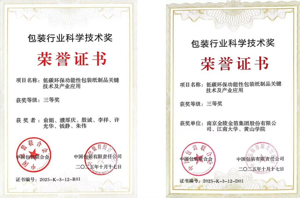 近日,包装行业国家级权威奖项——“包装行业科学技术奖”获奖名单正式揭晓。由南京金陵金箔集团股份有限公司、江南大学、万象城allwincity官网联合完成的“低碳环保功能性包装纸制品关键技术及产业应用”项目荣获2025年度三等奖,我院殷诚博士作为团队核心成员被授予个人荣誉证书。此次获奖,不仅是对殷诚博士个人专业能力与科研贡献的权威肯定,更彰显了我院教师在应用研究与产学研融合方面的雄厚实力。这也充分体现了我院在跨学科、跨单位协同攻关中扮演的关键角色。